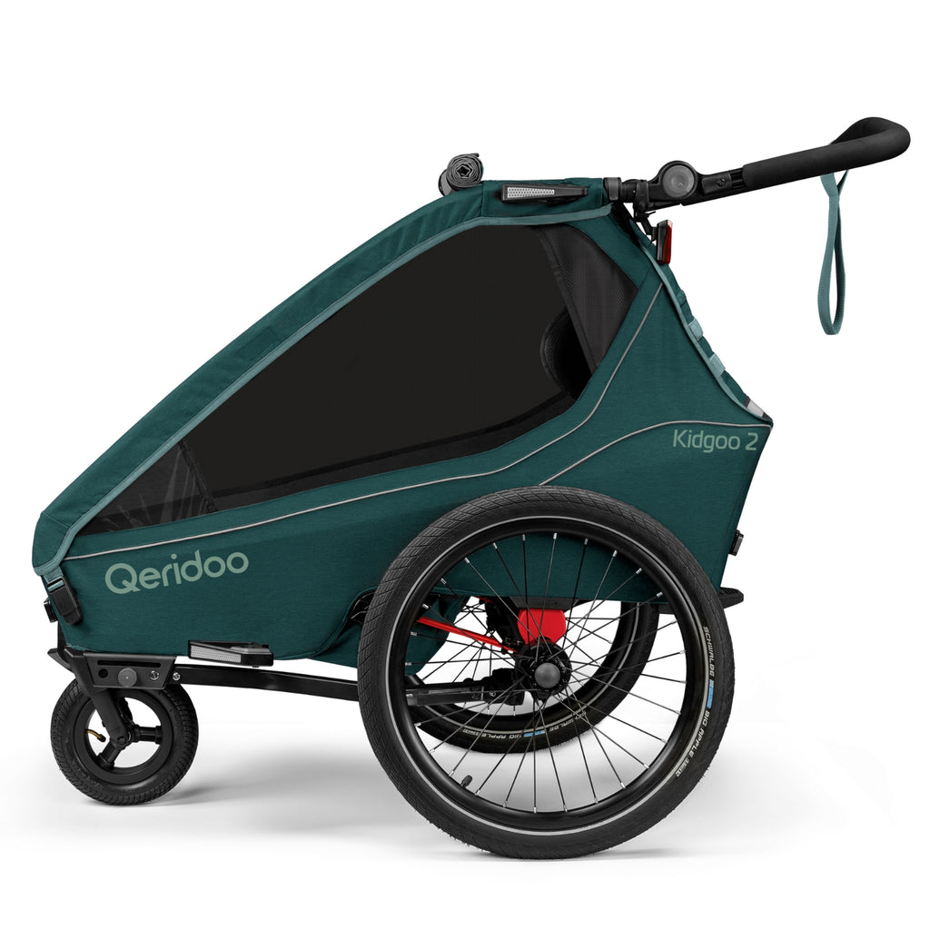Eigenschaften des Qeridoo Kidgoo2 Forest Green: - Radabweiser mit integriertem Buggyradhalter 5-Punkt-Sicherheitsgurte, in zwei Schritten verschließbar